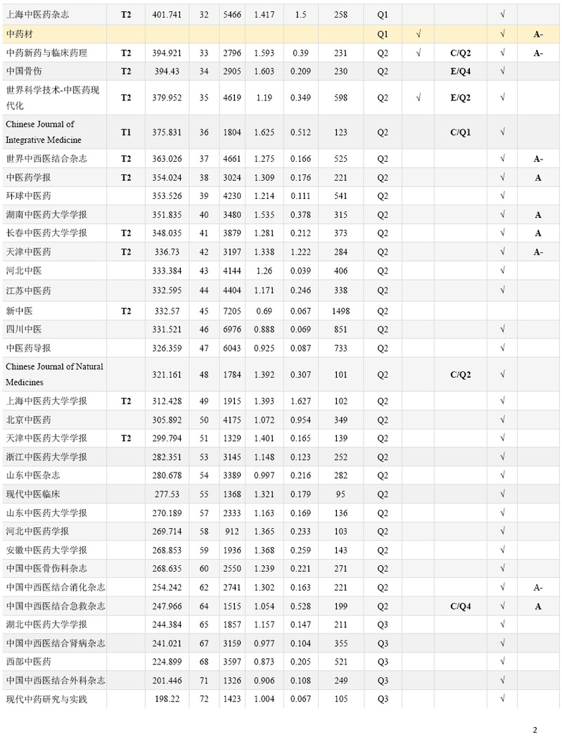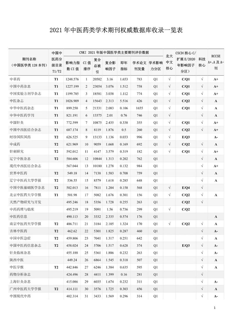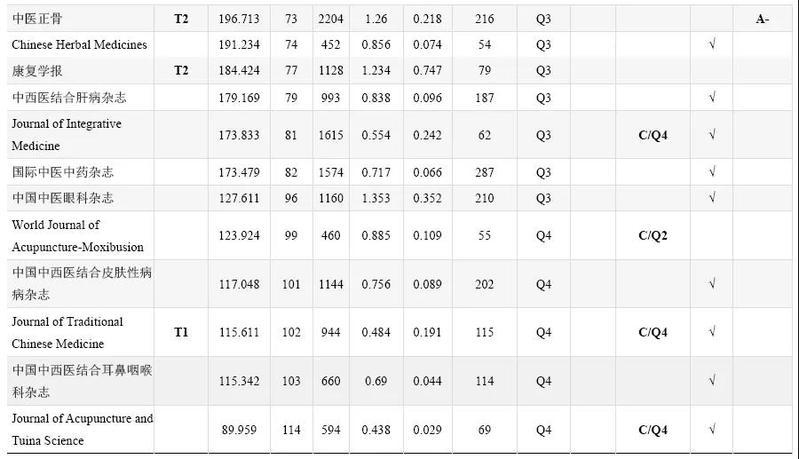 5.本表共收录77 本中医药学术期刊,至少被1 个以上权威数据库收录(科技核心、中文核心、CSCD、RCCSE(A-以上)或中医药分级目录T1T2 级期刊)。